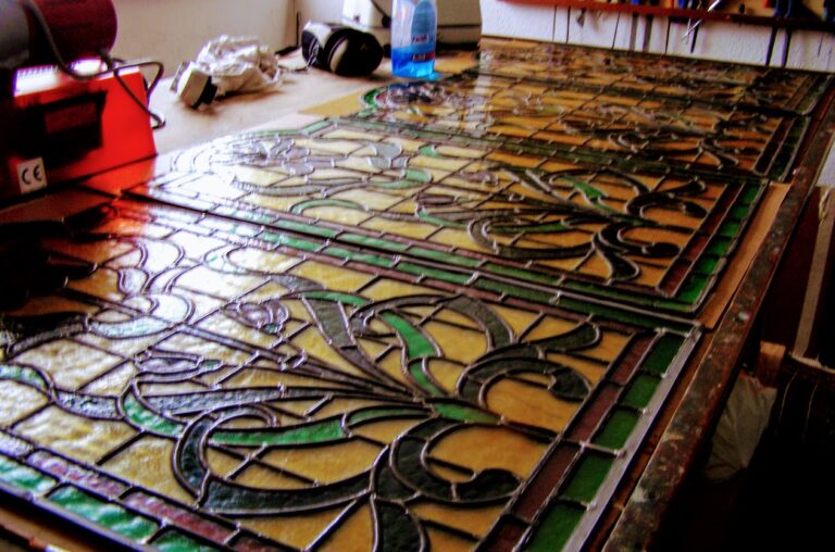 Op onderstaande foto ziet u gerestaureerde glas-in-lood panelen.